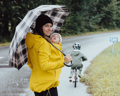 - nur mit einer Tragejacke kannst du sowohl dich als auch dein getragenes Baby vor Regen schützen, der schließlich von oben kommt und sonst in deine offene Jacke reinläuft. Ein Regenschirm hat oft den Nachteil, das das Wasser, das am Rand runterläuft, genau über den Rücken deines Babys läuft, weil dieses ja weiter weg ist von dir und vom Schirm nicht mehr richtig abgedeckt wird.
