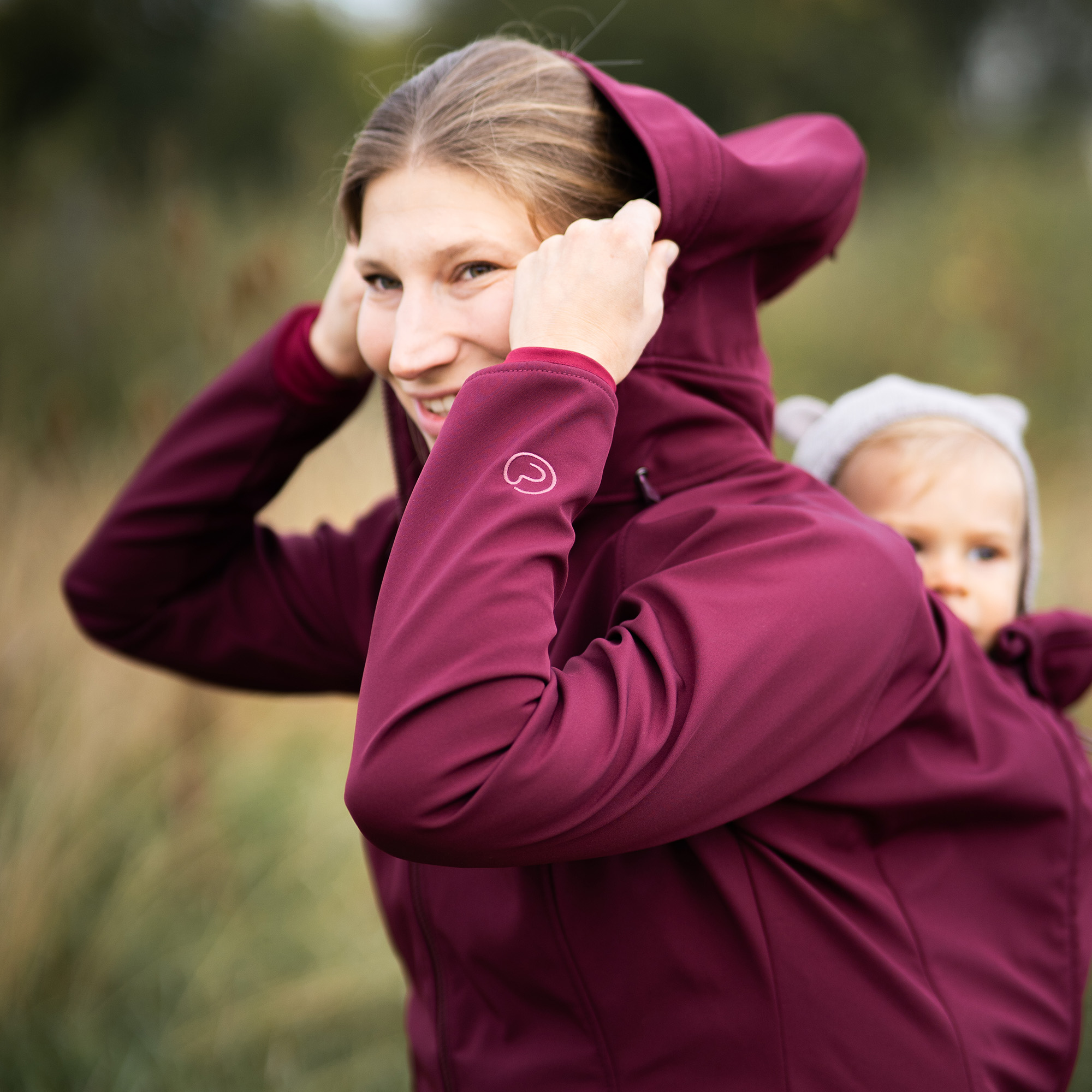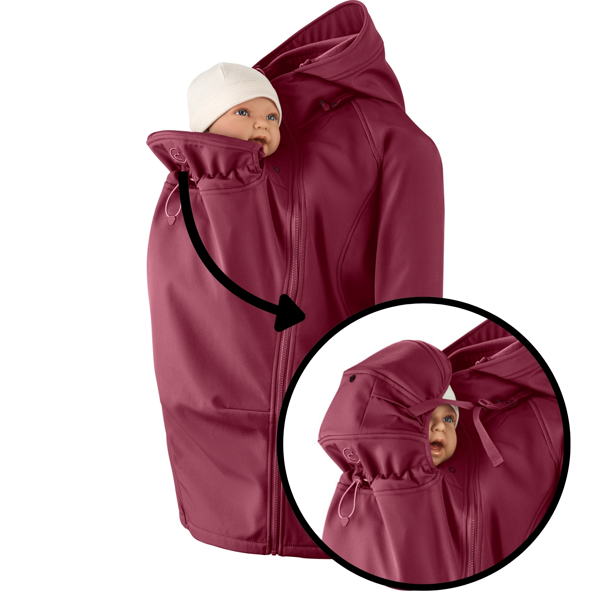 Der Babyeinsatz wächst flexibel mit deinem Baby mit und bringt eine eigene, stufenweise verstellbare Kapuze mit. Sie schützt vor Wind und dient gleichzeitig als Kopfstütze, wenn dein Baby einschläft – einfach an der Jacke befestigen und fertig. Außerdem kannst du den Babyeinsatz ganz individuell an Tragehöhe und Alter deines Babys anpassen. Und beim Rückentragen? Deine eigene Kapuze muss jetzt nicht mehr abgenommen werden, sondern lässt sich nah am Nacken fixieren. So hat dein Baby freie Sicht und frische Luft – ganz ohne verlorene Kapuzen oder umständliches Umziehen.