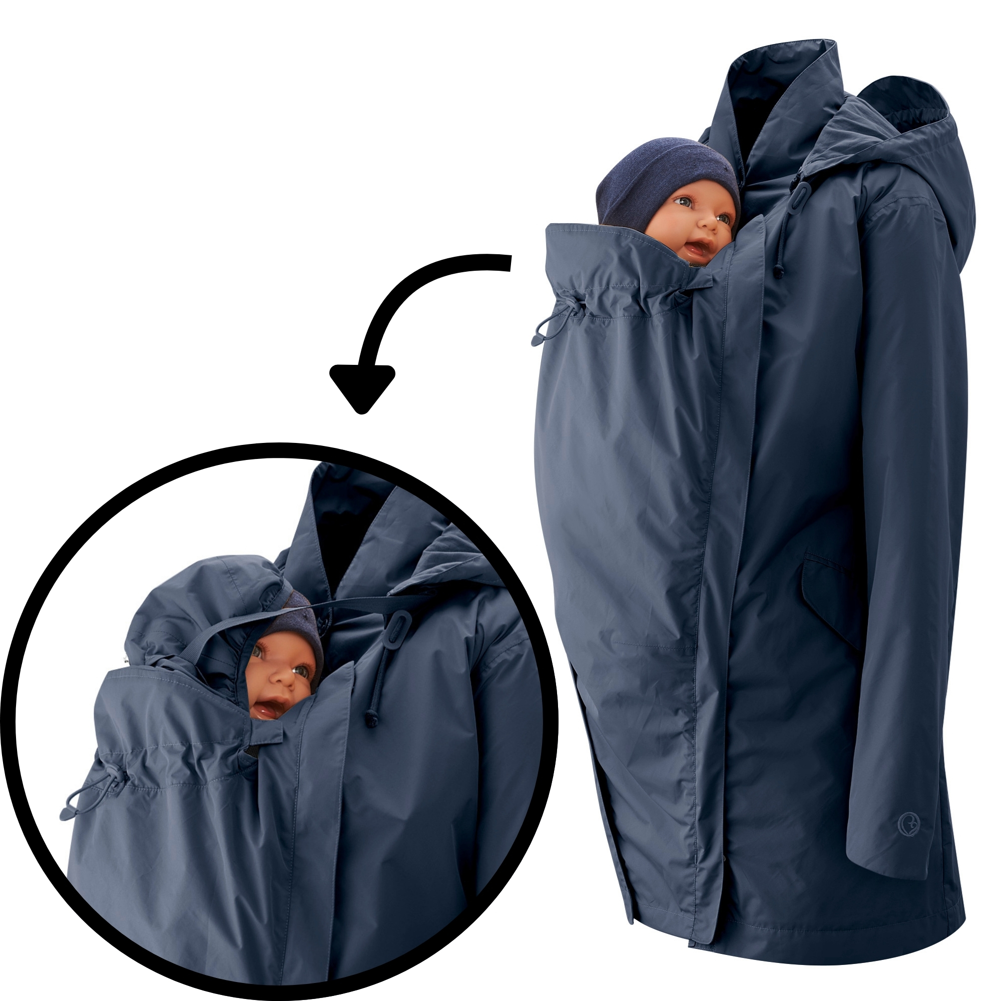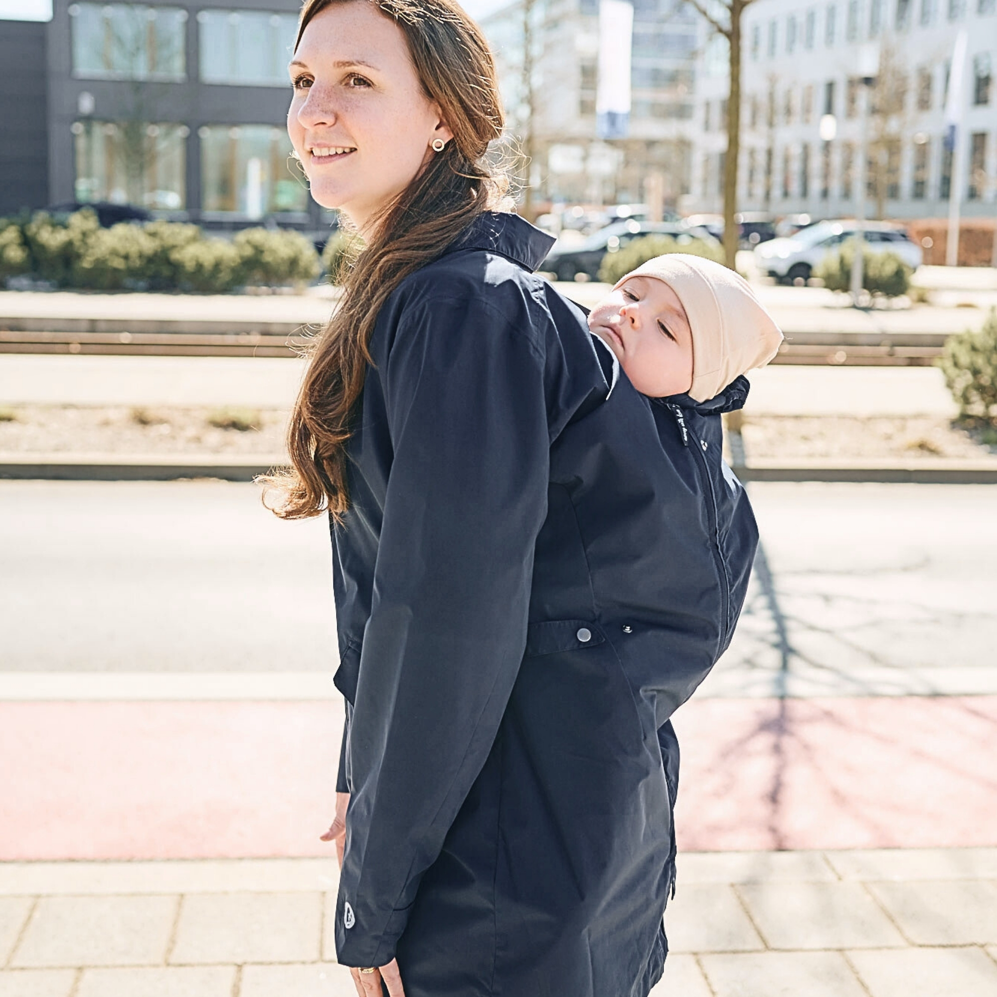 Du kannst ihn aber nicht nur zum Tragen, sondern bereits in der Schwangerschaft als Regenmantel nutzen: Zu Beginn lässt sich einfach die Taillenweite verstellen, so dass der Mantel sich vorteilhaft an Deine Silhouette anpasst, später zippst Du den beiliegenden Schwangerschaftseinsatz ein und erweiterst den Mantel für Deinen wachsenden Babybauch.