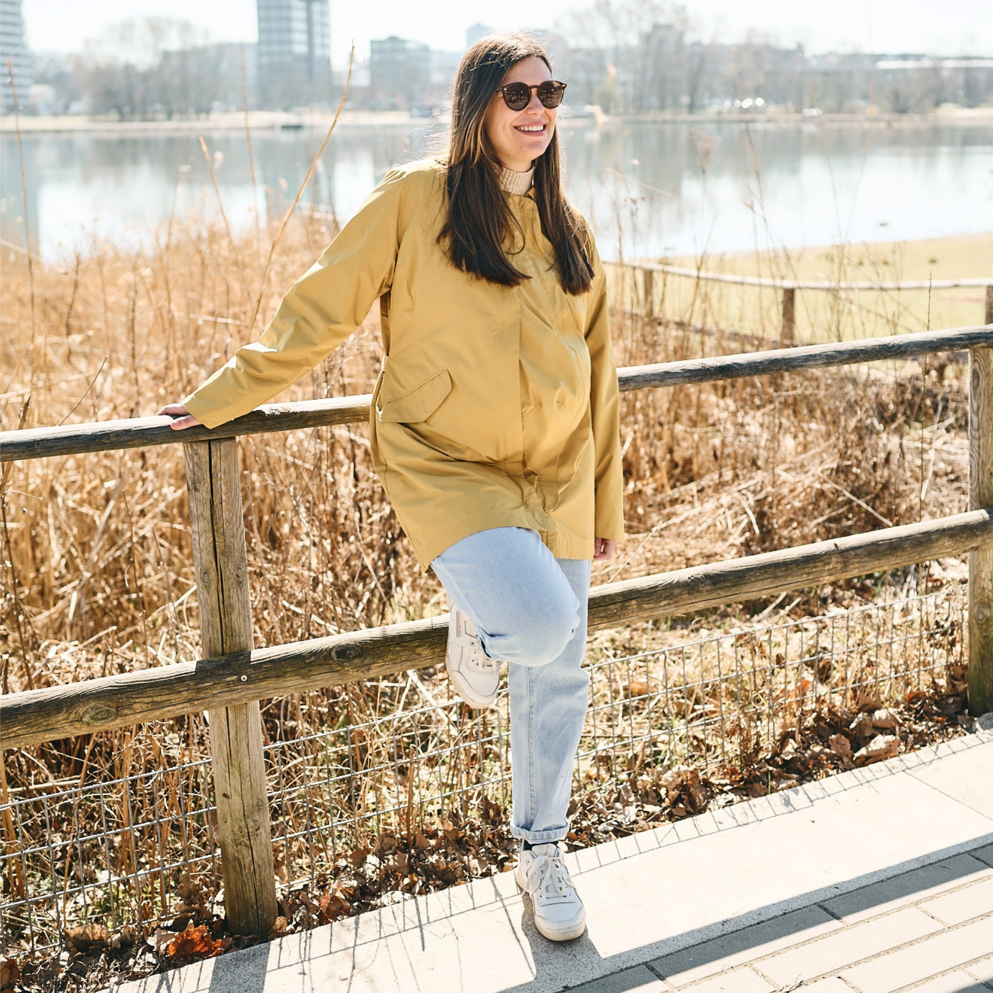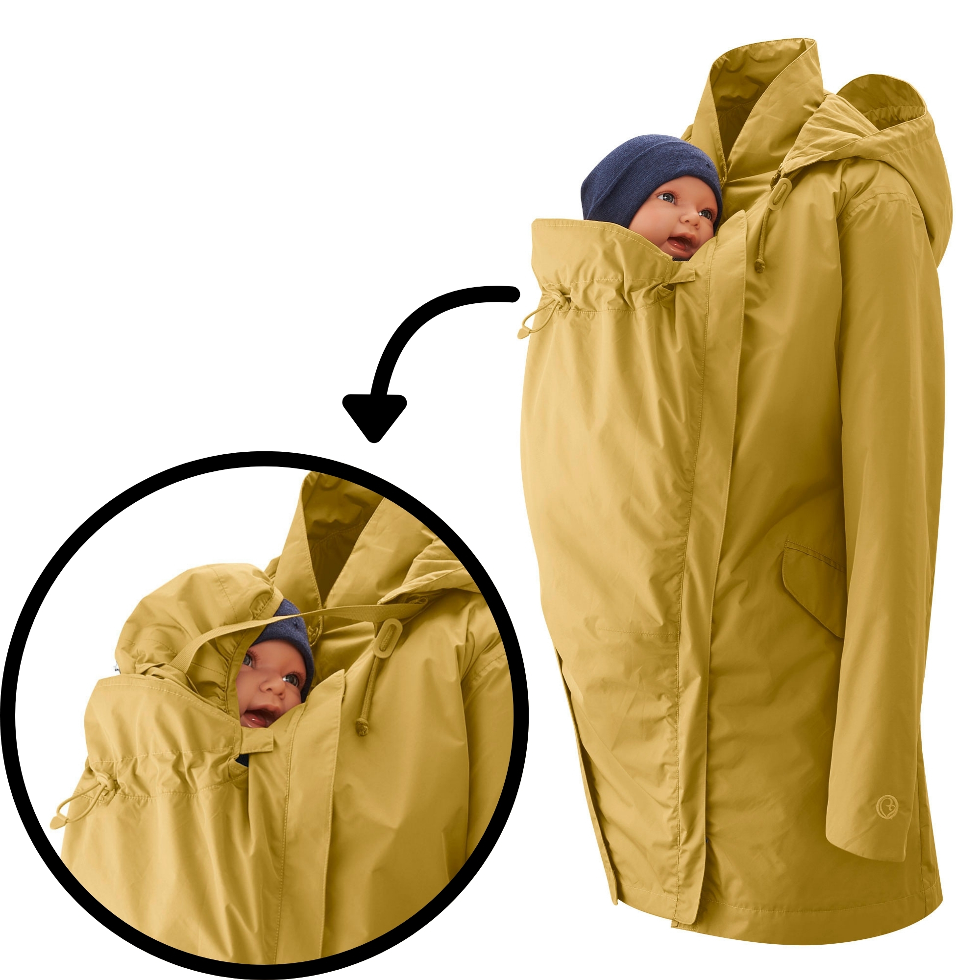 Du kannst ihn aber nicht nur zum Tragen, sondern bereits in der Schwangerschaft als Regenmantel nutzen: Zu Beginn lässt sich einfach die Taillenweite verstellen, so dass der Mantel sich vorteilhaft an Deine Silhouette anpasst, später zippst Du den beiliegenden Schwangerschaftseinsatz ein und erweiterst den Mantel für Deinen wachsenden Babybauch.