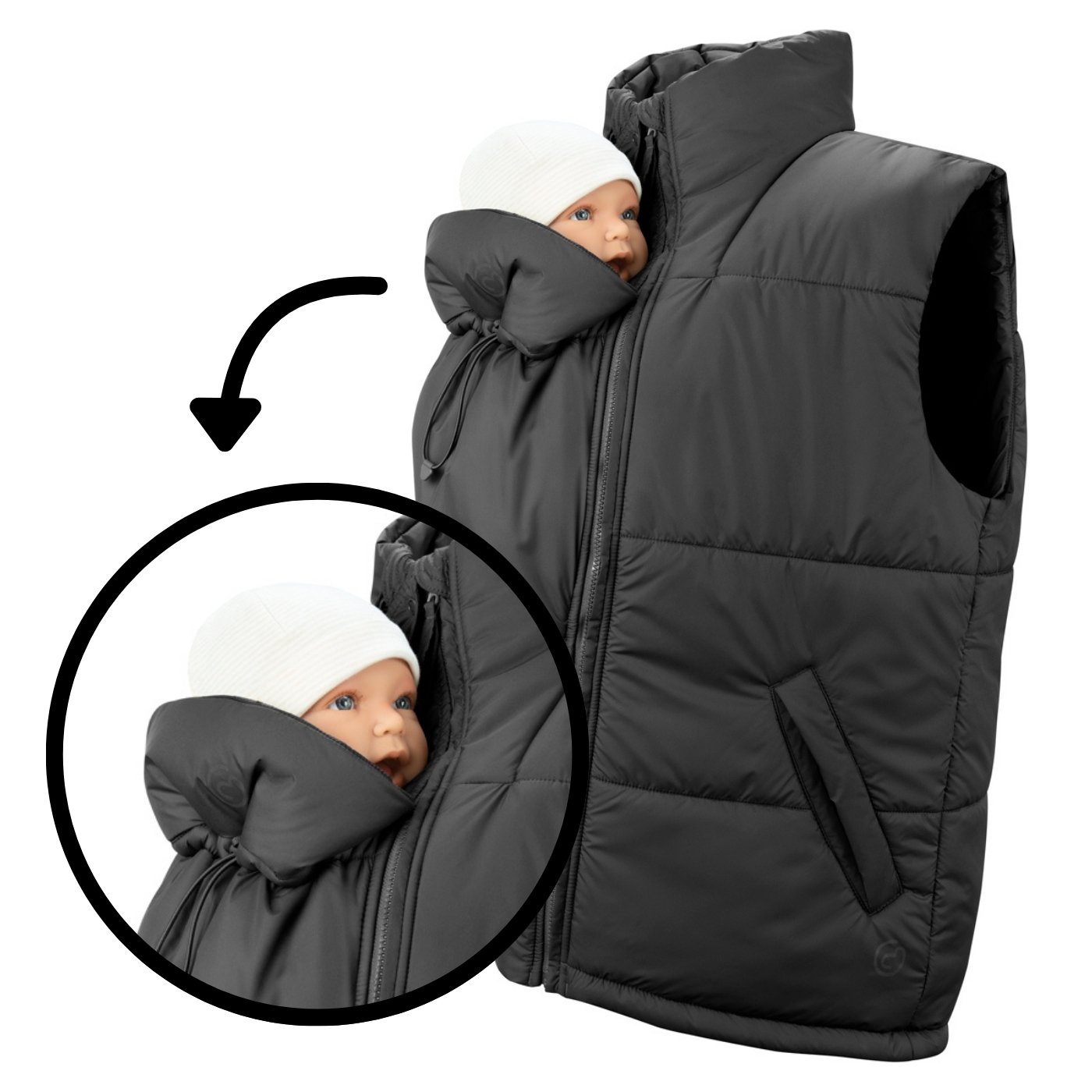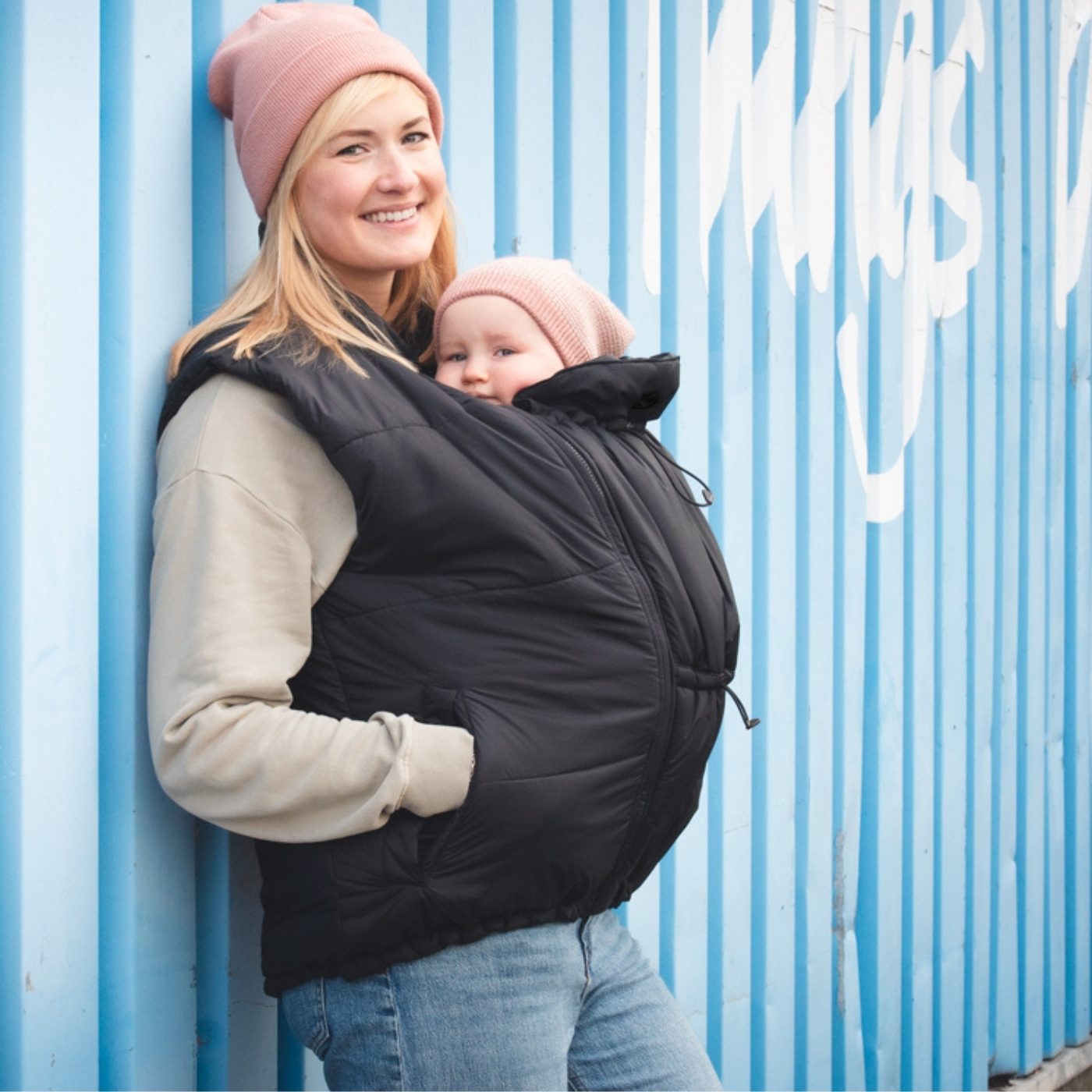 Und schließlich kannst du die Trageweste auch über einer anderen (Trage-)jacke tragen, die dir im Winter zu kalt ist, denn durch den Oversized Schnitt passt sie auch über eine andere Jacke.