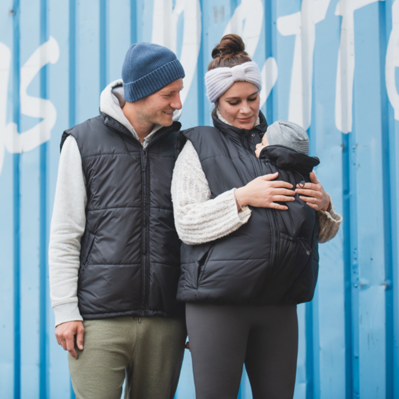 Da die Steppweste im Oversize-Look kommt, passt sie auch dem Papa, wenn er das Baby trägt - so könnt ihr euch perfekt abwechseln!