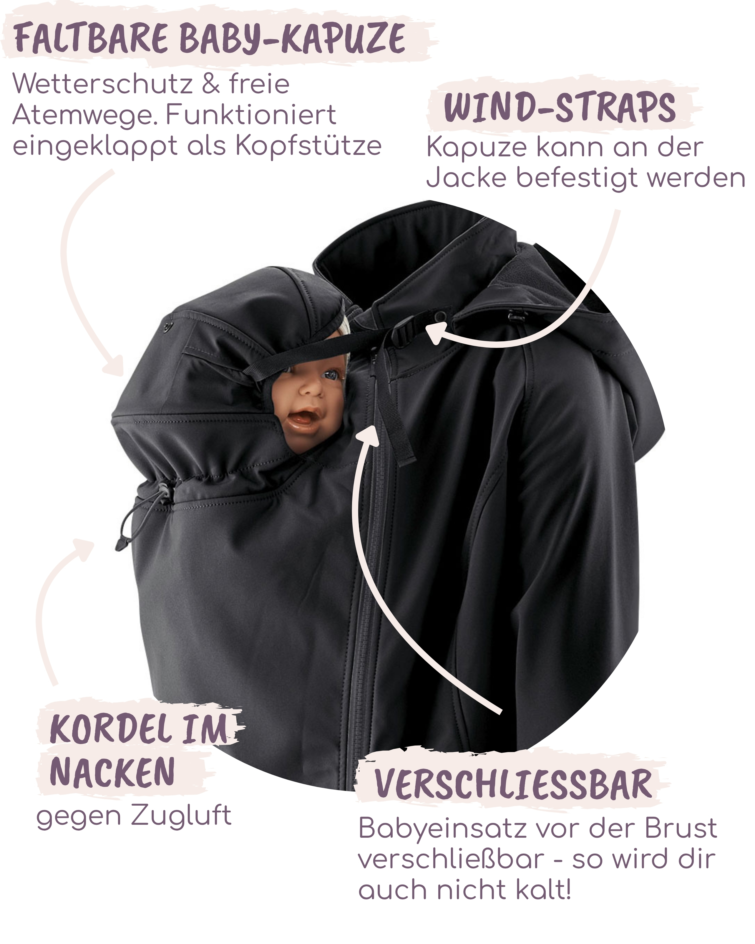 Für die Zeit mit Baby sorgen praktische Details wie die faltbare Babykapuze mit Windschutz, eine verschließbare Trageöffnung für extra Wärme und kuscheliges Fleece-Innenfutter, das euch beide warmhält.