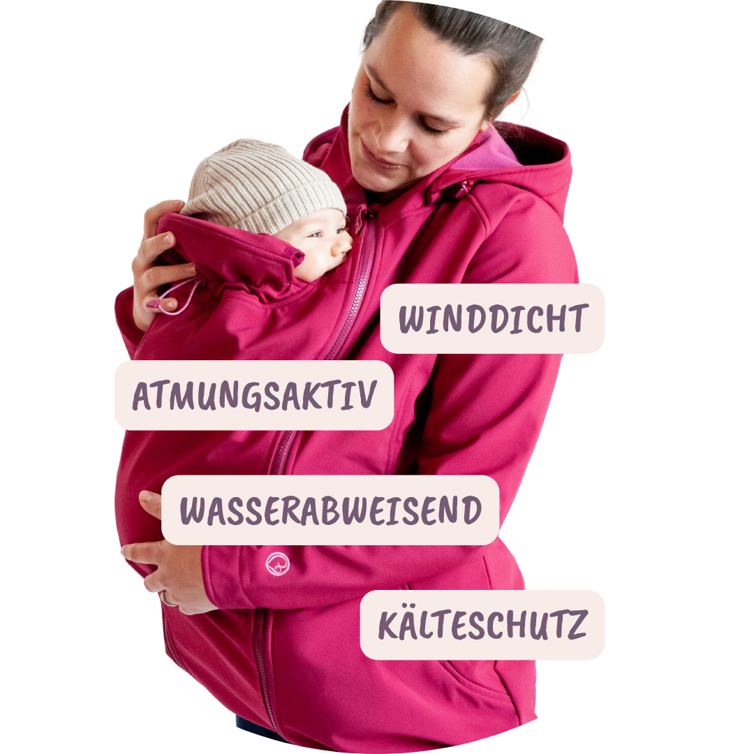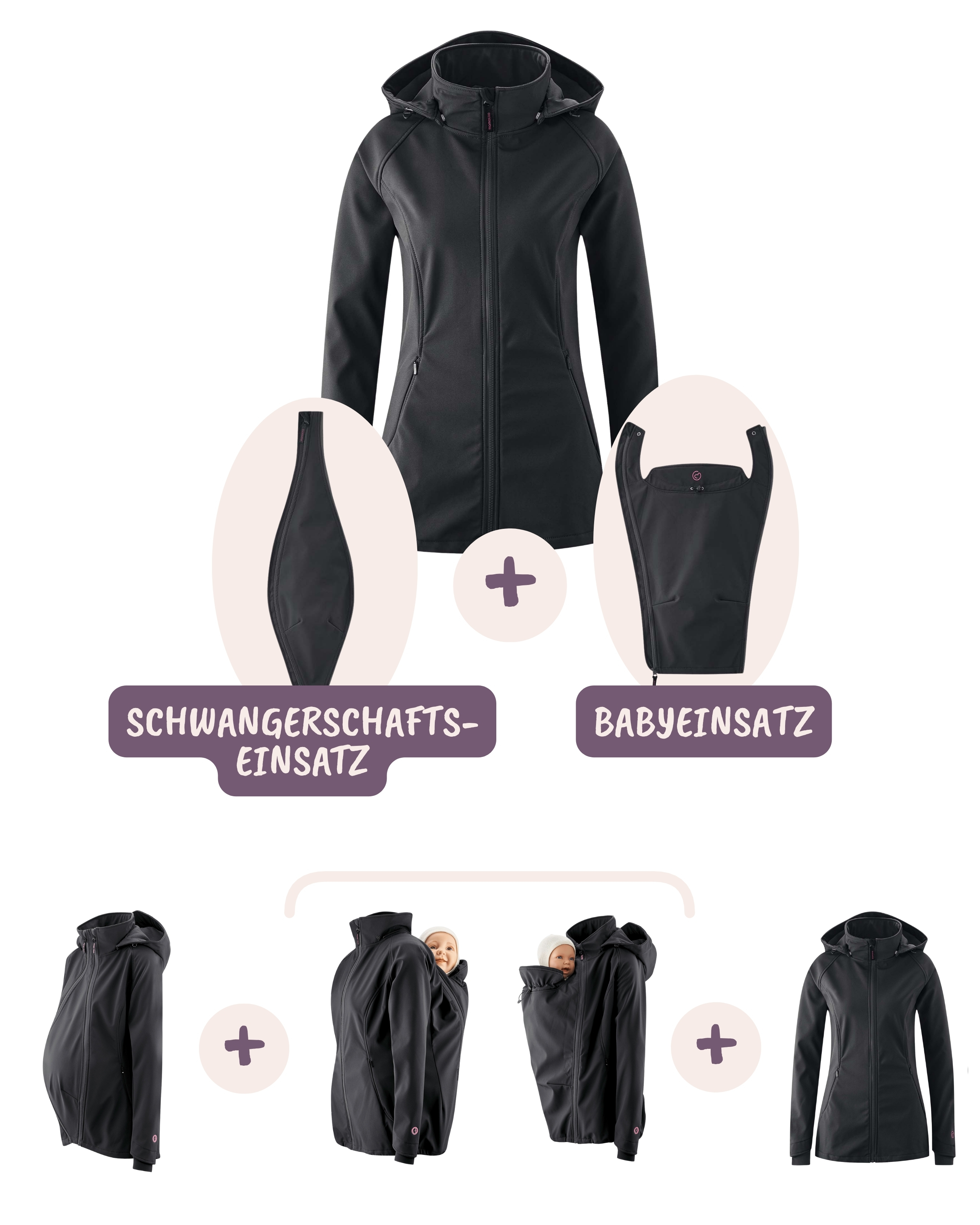 Ob vorne oder hinten getragen – unsere Softshell-Tragejacke wächst mit dir und deinem Baby mit! Dank cleverem 4-in-1-System ist sie dein treuer Begleiter in der Schwangerschaft, beim Tragen vor der Brust oder auf dem Rücken – und natürlich auch solo.